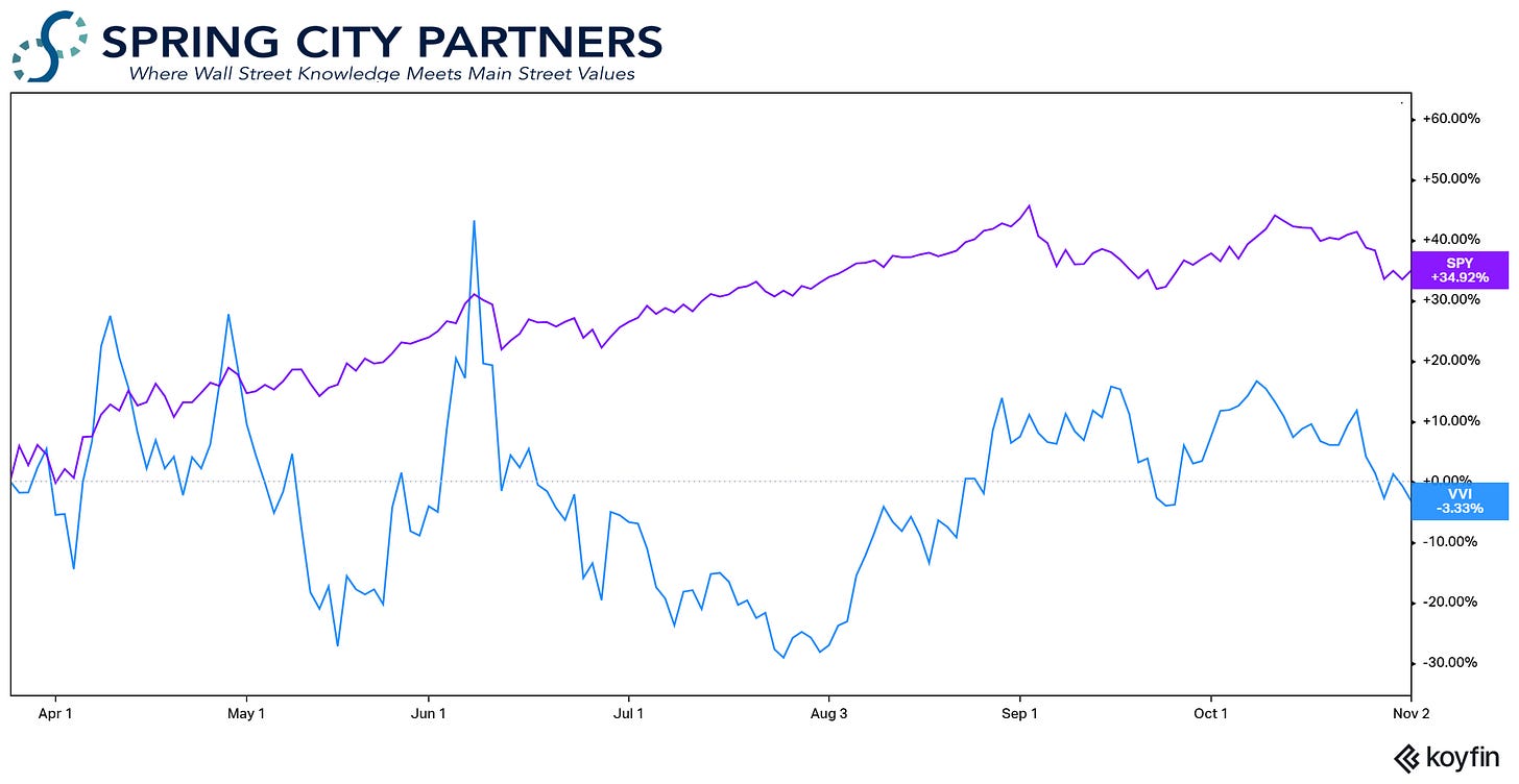 As you can see in the chart below, that proved to be a poorly timed decision. While the stock market raced higher over the summer months, this position languished. Despite having a firm understanding of the business and confidence in management’s ability to navigate COVID-19, the market didn’t seem to care about the value I saw in VVI.